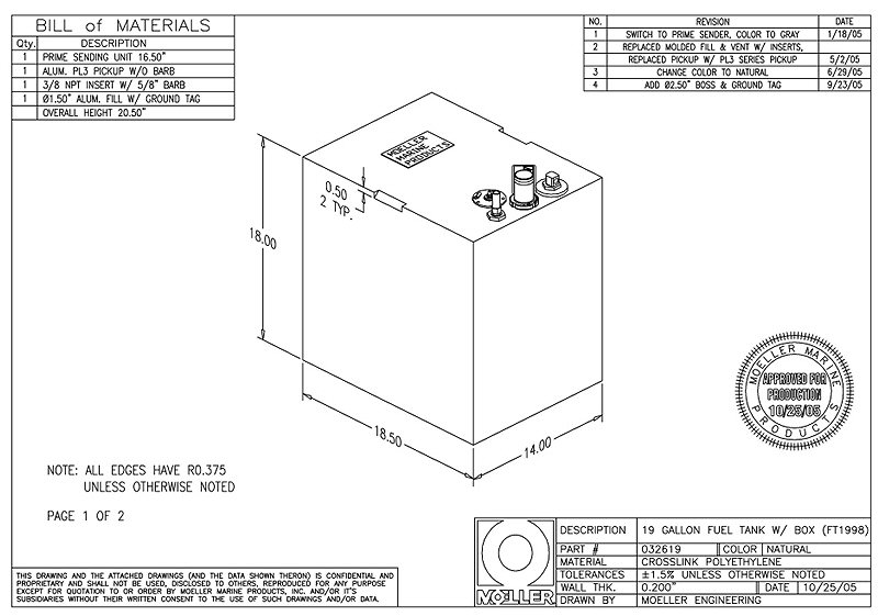 Specially designed for below deck applications, Moeller tanks are manufactured from rotationally molded, cross-linked polyethylene plastic and feature corrosion/pit resistance and exclusive Moeller Tite pioneering. Each tank is equipped with an electrical sending unit that is compatible with industry standard dash mounted gauges, Hose Tite, machined aluminum fill spouts, withdraw, and vent fittings molded directly into shell. All below deck Moeller tanks are ideal for gasoline or diesel.