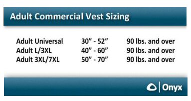 Onyx type I commercial adult universal life jacket has an adjustable belt with a quick snap buckle. Highly visible bright orange vest with six sewn in reflective strips. USCG Approved Type-I PFD / Life Jacket. Weights approved for 75+ lbs.